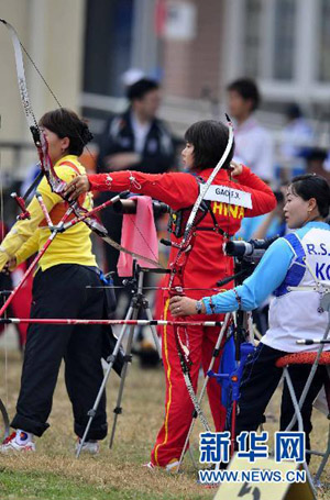12月13日,中国选手高芳霞(中)在比赛中。当日,在广州2010年亚残运会女子个人反曲弓站姿排名赛中,中国选手高芳霞以641环的成绩打破世界纪录。新华社记者陈晔华摄