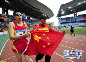 12月14日,李端(左)在比赛后与引导员一起庆祝。当日,在广州2010年亚残运会田径男子跳远F11级比赛中,中国选手李端以5米96的成绩获得金牌。新华社记者陈晔华摄