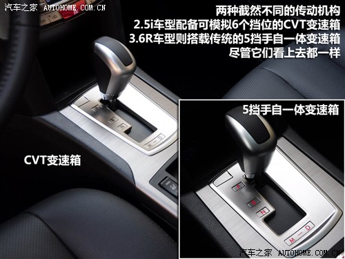 斯巴鲁另外一项引以为荣的技术是水平对置发动机,从理论上来讲可以降低重心以提供车辆的操控稳定性,对减轻机器运转时的震动也有积极影响,目前坚持采用相同技术的还有保时捷。傲虎的四款车型分别搭载了2.5升H4和3.6升H6发动机,它的主打还是2.5升车型,与之配备的是具有优秀平顺性的CVT无级变速箱;而动力更强的3.6版本采用了5AT自动变速箱,显然为了承受更大的扭矩,当然7.5秒的百公里加速也很不错,相比之下,2.5升车型的10.4秒算是刚刚够用吧。另外,斯巴鲁的SI-DRIVE系统只出现在了3.6升车型上,允许用户在智能模式、运动模式和超级运动模式之间自由选择。