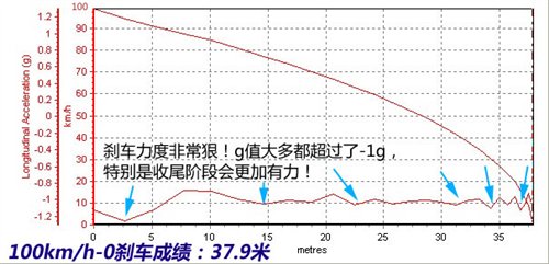 说到这里,要顺便说说我们曾经测试过的X1 xDrive28i,凭借3.0升发动机的强大动力输出,在0-100Km/h的加速测试中取得了7.4秒的好成绩,如果说加速只能代表这一款车型的话,那么我认为刹车成绩基本可以代表全系车型,对于底盘更高的SUV而言,宝马X1依然可以做到37.9米的成绩,刹车过程中减速度大多都超过了1g,令人不得不对它的性能刮目相看。