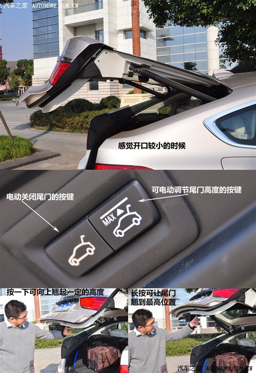 5系GT的后背箱在高度上比三厢车更有优势,在尾门开启的设计上也颇为巧妙,它不仅可以将“后盖”独立打开,而且整体掀开时的高度也可以控制,既灵活又新颖,从中也不难看出宝马设计师的巧妙构思。当然,在这种级别的车型上,电动尾门已经不再新鲜。