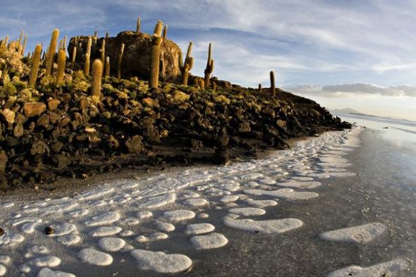 乌尤尼盐沼上一座长满巨型仙人掌的小岛显得特别突出。根据当地传说,这片盐沼是在一位巨人用母乳喂养儿子时,眼泪与乳汁结合在一起形成的。事实上乌尤尼盐沼是在数千年前形成的,当时这里被咸水湖覆盖。湖水干涸后,留下的矿物丰富的盐水形成现在的盐沼。