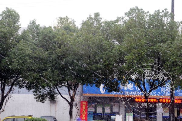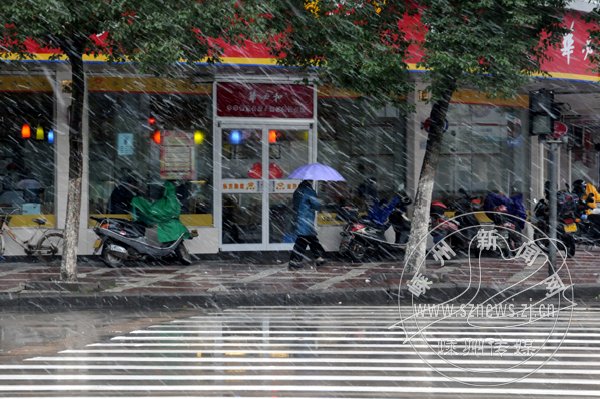 街上行人不多,几个穿着冬衣的市民手持雨伞,缩着身子,快步地走着。也有几人站在沿街的商店里,看着雪景,略有遗憾地说:“如果不下雨,光下大雪就好了,可以玩雪了。”