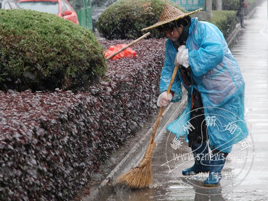 昨天上午10点左右,刺骨的寒风,漫天的飞雪,让行人睁不开眼睛,可环卫工人依然坚守着岗位。虽然落下的雪因为伴着雨并没有在地面上堆积起来,但由于道路变湿,不少树叶都贴在了路上,再经过车辆的碾轧,给环卫工作带来很大的麻烦。再加上天冷,环卫工人的工作环境也变得恶劣。清洁嵊州大道一段的何大妈告诉记者,为了清扫雨雪,她中午没有回去,就着咸菜吃了两个淡馒头。她笑着对记者说:“省点时间,早点好扫干净嘛。”据记者从市环卫处了解,这一天,全市有225个环卫工人奋战在迎击雨雪的第一线。