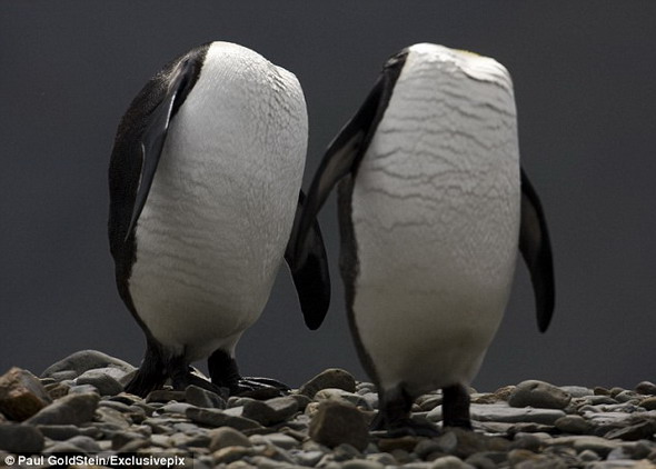 据国外媒体报道,从照片上这个角度看去,两只后仰头的王企鹅就像被“斩首”了一般,它们能做出这种动作都要归功于独特的脖子关节。这对“无头兄弟”以一个非常有趣的姿势,兴高采烈的站在一起。