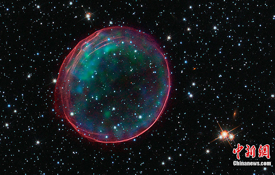 近日,美国哈勃太空望远镜拍摄到了美丽的星系间“圣诞大气泡”的照片。这个“圣诞大气泡”是由400年前发生的超新星爆炸的残骸形成的,它像一个精致的“壳”一样漂浮在太空中。据悉,这个“圣诞大气泡”是我们的临近星系——大麦哲伦星云(Large Magellanic Cloud)中的一颗超新星在爆炸时发出的冲击波及其喷射出来的物质,大麦哲伦星云与地球的距离为16万光年。科学家们将这个“圣诞大气泡”气圈命名为“SNR B0509-67.5”或者缩写成“SNR 0509”。据悉,这个如气泡状的气圈的直径为23光年,并且正在以超过1100万千米每小时的速度扩散。另外,哈勃太空望远镜拍摄到了“圣诞大气泡”处于各种不同情况下的照片。
