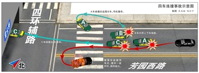 昨天(15日)凌晨2点多,在芳园西路与东四环辅路交叉口处,一辆黑色轿车引发四车连撞事故。除肇事车外,其他三辆轿车均为出租车。事故中,一名出租车司机伤势极其严重;肇事车起火,另一辆出租车内的人员在危急中将肇事司机解救。警方证实,肇事者为酒后驾车。
