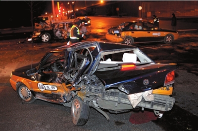 昨天凌晨3点多,记者在现场看到,肇事轿车烧得只剩框架,已经无法辨识具体车型。道路左侧一段近2米长的护栏被撞坏。受损的3辆出租车仍在原地,其中捷达出租车的后部已呈麻花状;另外两辆出租车的尾部被撞得凹了进去,几乎从三厢变成了两厢。多名民警正在现场勘察,不少过路的的哥纷纷停下车,走上前查看情况。看到这3辆出租车受损严重,他们都关切地询问:“撞得太严重了,也不知道司机怎么样了。”
