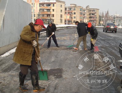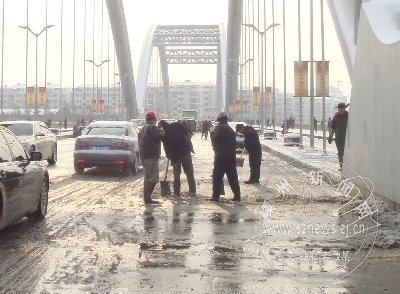 昨天纷纷扬扬的一场雪给市民带来了不少乐趣,但同时也给今天的交通带来很大影响,不少车辆因冰雪打滑发生交通事故。今天上午,很多市民冒着寒风自愿上街铲冰雪,为方便市民出行尽自己的一份力。 图为热心市民在嵊州大桥上铲冰雪。