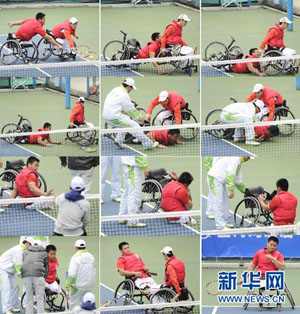 12月16日,在广州2010亚残运会轮椅网球男子单打1/4决赛中,中国选手冯小敏和队友魏祖军为了救球撞在一起,导致比赛轮椅翻倒,冯小敏从从轮椅上摔倒在地并受伤,在队友魏祖军和现场志愿者的帮助下,冯小敏重新坐在轮椅上,经过简单调整继续比赛,并和队友以2比1战胜斯里兰卡选手加米尼·迪萨纳亚克·穆迪/乌帕利·拉贾克鲁纳·穆德组合,进入半决赛。(拼版照片)新华社记者岳月伟摄