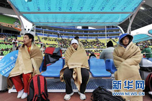 12月16日,参加男子铁饼F35/36级决赛的运动员裹着毛毯等候比赛开始。当日,受冷空气的影响,广州的气温降至5摄氏度左右。主办方为参加亚残运会田径比赛的每位运动员准备了一条毛毯,以便运动员在候场时保暖。新华社记者陈晔华摄