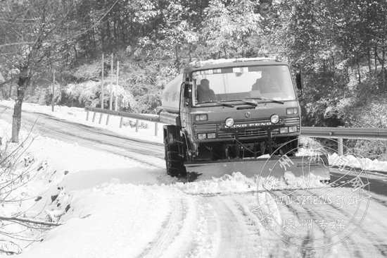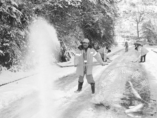 据了解,这次大雪造成绍甘线丰田岭路段积雪厚10多厘米,路面湿滑,公路段派出了10多辆车、200余人参与扫雪除冰工作。记者看到,养护工人还在风大的弯道铺设了防滑石料,并在道路上施撒融雪剂,防止因路面再次冰冻而引发交通事故。