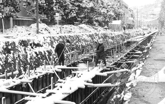 昨日早上,在城区排涝设施建设与改造工程现场,工人们正在扫除积雪,以确保作业安全。