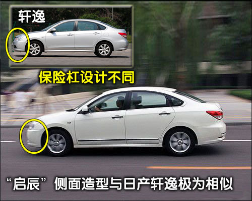 “启辰”无伪装侧面造型与东风日产的轩逸十分相似,车身线条以圆润为主,十分轻快。同时从车门的面积来看,“启辰”尺寸与轩逸相差不大,由此我们可以推断,“启辰”很有可能与轩逸同出于日产的C平台。目前在日产C平台上研发的车型有轩逸、奇骏、逍客。