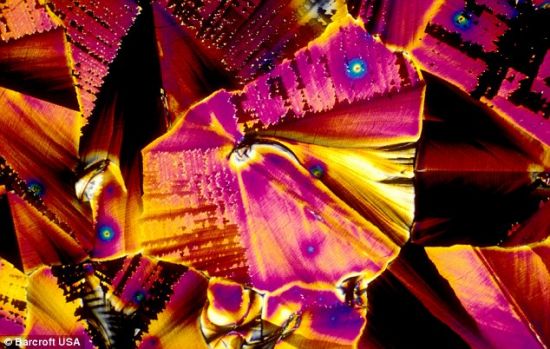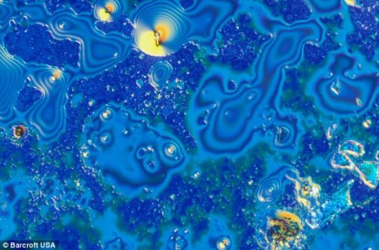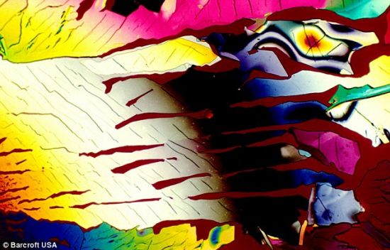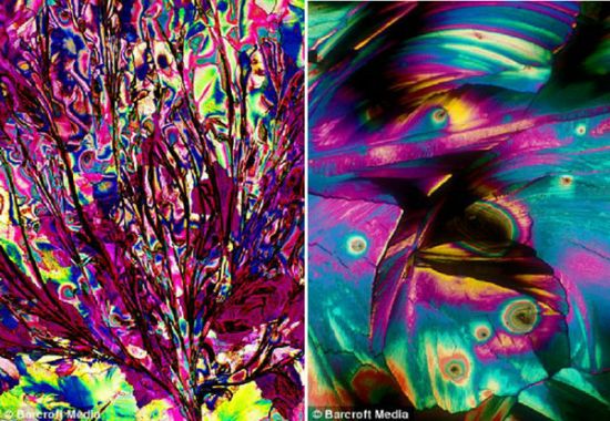 这些图片是由美国公司Bevshots制作的,它们显示的是鸡尾酒里不同成分包含的令人难以置信的分子和千变万化的颜色。这些照片是在佛罗里达州立大学化学系拍摄的,它们捕捉的是最受欢迎的伏特加、冰镇果汁朗姆酒和夏布利酒等饮品的组成成分。Bevshots创始人莱斯特·赫特解释说:“你在这些放大照片里看到的是已经变成糖和葡萄糖的结晶碳水化合物。每张图片都是利用吸液管把每种特殊饮品放在载玻片上制成的。等到这些液体变干后,把载玻片放到显微镜下,开始拍照。”
