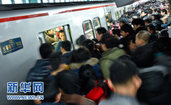 北京地铁1号线四惠站的拥挤程度在网友中广为流传,进站的列车车门尚未完全打开,乘客已经开始向车内涌入(12月14日摄)。