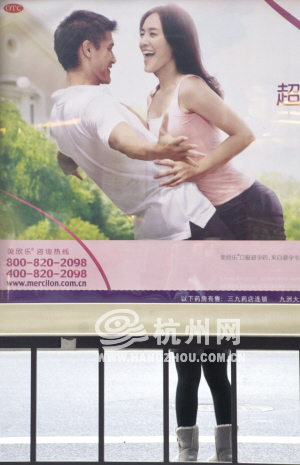 昨天,根据卢老师提供的地点,在杭州市区体育场路、凤起路、庆春路等主要路段转了一圈,只在庆春路皮市巷口、建国中路章家桥两个公交候车亭看到了“美欣乐”口服避孕药的广告。