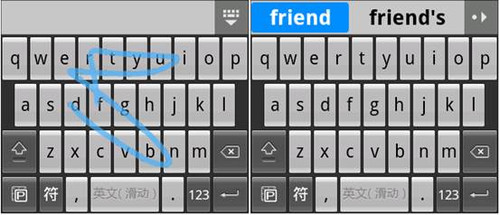 首先,进入QQ手机输入法中的QQ实验室,勾选滑动输入功能,再进入普通的键盘输入模式,其实,滑动输入的界面和普通的英文按键界面没有区别,当我们在滑动输入界面移动手指,指触通过的位置会有明显的轨迹显示,例如输入”friend”,通过滑动输入从”f”开始依次滑动到”r””i””e””n””d”的大概位置即可,这时候选区就会显示”friend””friend’s”等候选结果。怎么样,输入过程就像是随意的涂鸦一样,结果却精准无比,很神奇吧?滑动输入方式比起传统的按键方式在输入速度上有了极大的提高,并且能有效得减少因为键盘太小而产生的输入误差。滑动输入方式遵循的理念就是在最短的时间内用最少的按键次数完成输入。(图1)