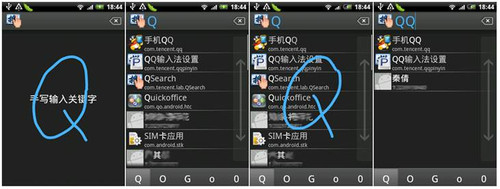在安装QQ手机输入法时小编发现一个小的细节,安装向导会提示用户是否安装Qsearch的功能,究竟Qsearch是什么东西呢?小编尝试进入QQ实验室,勾选这个功能,发现在桌面会添加一个”Qsearch”的图标,使用后发现这个工具的功能十分强大,竟然可以在手机系统中搜索联系人、短信和程序等;通过在Qsearch全屏手写输入关键字,就可以根据设定的内容进行搜索,搜索到的内容可以直接运行其对应程序;非常适合当手机中有大量的短信、联系人、应用程序的时候,要精确的定位到某个具体的目标时使用。作为输入法的一个小插件,能把手写和搜索完美的结合,这个创意还是很新颖的; (图3)