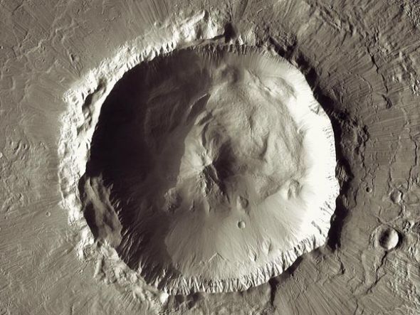 一颗陨石猛烈撞击火星,在地表形成巴库洛尔(Bacolor)陨石坑,碰撞产生的能量使地表远古物质向四面八方飞溅。巴库洛尔陨石坑是这颗红色行星表面的一个直径12英里(20公里)的深坑。这张“宏伟壮观的”火星陨石坑图片,是利用“火星奥德赛”探测器上的热辐射成像系统(THEMIS)在2002年到2005年间拍摄的照片合成的。据美国宇航局说,这周“火星奥德赛”探测器成为火星史上工作时间最长的飞船。