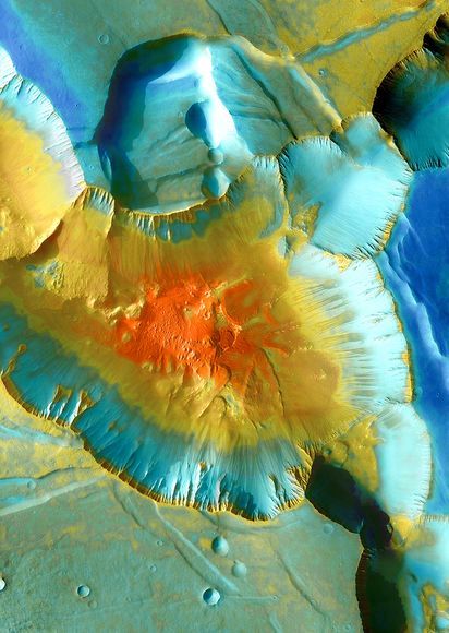 这张迷宫(Noctis Labyrinthus )的峡谷伪彩色合成图,是用“火星奥德赛”在2003年4月到2005年9月间收集的图片合成的。该图着重强调了一个峡谷交汇处形成1.3万英尺(4000米)深的洼地。