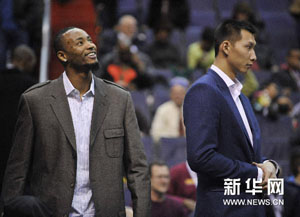 12月20日,奇才队球员易建联(右)和拉沙德·刘易斯在场边观战。当日,在2010-2011赛季NBA常规赛中,华盛顿奇才队主场以108比75战胜夏洛特山猫队。新华社记者张军摄