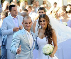 虽然有欧洲冠军杯的大耳朵可以去捧,虽然世界杯杀入到决赛之中,而且个人表现有目共睹,但没有拿到世界杯冠军,对于荷兰球星斯内德来说,不能不说是巨大遗憾。好在世界杯后他和约兰特的超级婚礼,多少弥补了他不爽的心情。两万朵白玫瑰、70名工作人员、360名、大多数都是球迷耳熟能详的大腕来宾,集体粉色装束,在意大利新卡斯特的珍珠城堡,这场金子般的罗曼蒂克婚礼,让斯内德心情回复了平静,他无疑是世界杯后扎堆结婚的球星中最风光的一位。