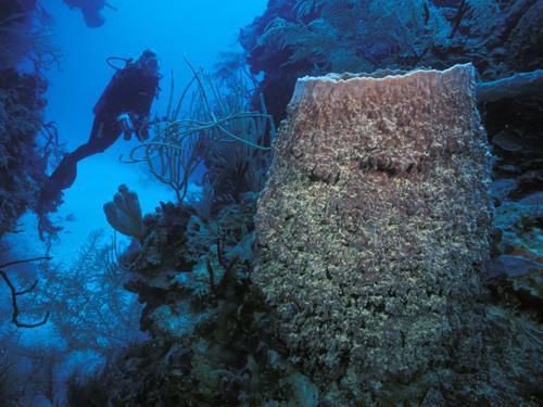 当人们在加勒比海潜水时会经常遇到巨型桶状海绵,它的外壳上生存着光合作用共生细菌。