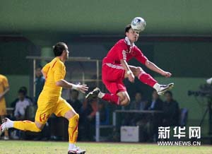 12月22日,中国队球员郜林(右)在比赛中停球。当日,中国国家男子足球队在广州举行的亚洲杯热身赛中,以1比0战胜马其顿队。新华社记者卢汉欣摄