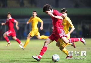12月22日,中国队球员李学鹏(前)在比赛中进攻。当日,中国国家男子足球队在广州举行的亚洲杯热身赛中,以1比0战胜马其顿队。新华社记者卢汉欣摄