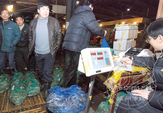 两个小时后,已是晚上8点。我们的车徐徐驶进了杭州水产批发市场。此刻,市场里已是车水马龙,人声鼎沸,一派忙碌的景象。