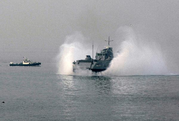 资料图片 11月28日,在韩国首都首尔西南约170公里的一处海滩,韩国士兵在参加登陆演习前进行训练。新华社/路透