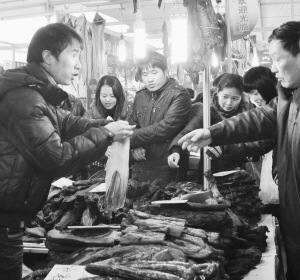 为过年购买一些腊肉是嵊新两地市民的传统习俗之一,近日,两地市场里,人们已开始购买腊肉、香肠之类的年货。图为12月17日,嵊州一商场里,人们抢购腊肉的现场。