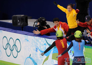 李琰东奥会上与王濛庆祝胜利。
