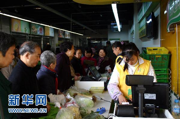 资料图:11月30日,众多市民在成都生鲜超市购买农副产品。新华社记者 刘海 摄