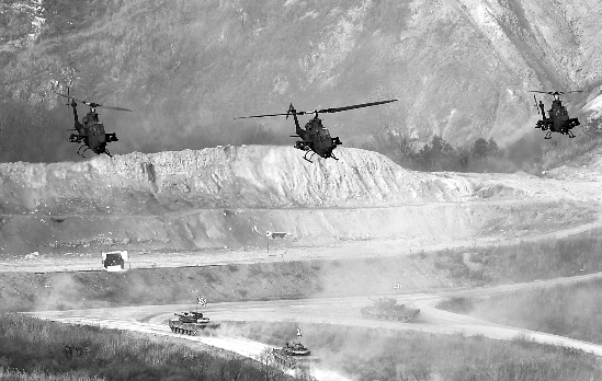 23日,韩国抱川,K-1坦克和AH-1S攻击用直升机在演习中。
