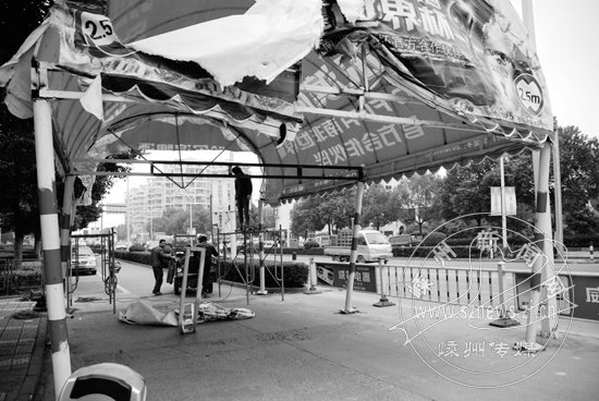 “刚修好才几个小时,又被车撞坏了。”12月24日上午,记者在嵊州大道艇湖路口看到,一个遮阳篷的篷梁裂开了,和水泥地面固定的底座被连根拔起,固定底座的几颗大螺丝也散了架,整个遮阳篷摇摇欲坠。正在维修的师傅告诉记者,遮阳篷限高2.5米,本只是行人和非机动车遮阳避雨的地方,可现在有些机动车利用非机动车道右转来躲避红灯,撞坏了遮阳篷。这个遮阳篷他们在23日下午刚维修过,可第二天晚上又被车撞坏了。