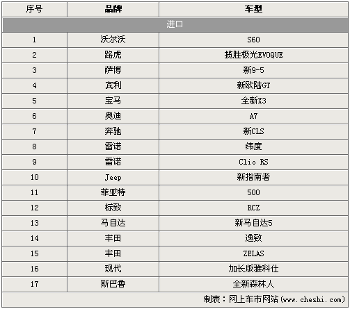 进口车在2011年将会为消费者带来17款新车,沃尔沃的S60是万众期待的一款全新车型,拥有非常高的安全和运动性能。宝马全系换代的X3以全新的姿态登场亮相,奥迪带来高端轿跑车型A7,奔驰换代CLS车型也将登录国内市场。雷诺纬度、菲亚特500、标致RCZ、新马自达5、丰田逸致等重量级车型也将陆续与消费者见面。