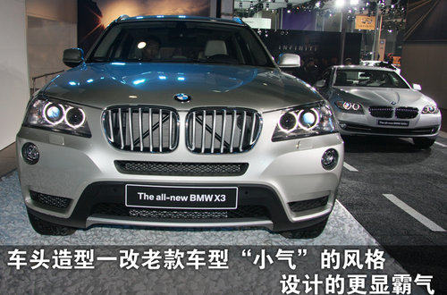 前脸部分改动明显,除了保留宝马双肾样式进气格栅以外,其他地方都存在很多革新亮点。拱起的长条状大灯,依稀能看出宝马全新的家族性元素,主流KED灯组的加入突出了车型节能环保的低碳理念。BMW EfficientDynamics(高效动力)策略最新科技的应用,确保X3在增强动力的同时,满足EU5的排放标准,既节省了燃油消耗,同时降低了CO2排放。AutoStart/Stop(发动机自动起动/停止功能)首次搭载8挡自动变速箱,在X3汽油机车型上率先应用。电动助力转向也首次应用于宝马X家族。其它装备还包括制动能量回收系统、可智能分配能耗的电子水泵等。