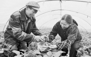 12月25日,在嵊州市甘霖37省道收费站边的一块出租农田里,来自建德的两位老农正在采摘上市的第一批草莓。据老人介绍,嵊州的气候条件优越,首次引种“牛乳”品种的草莓就获得了成功。 (记者 张亮宗 摄)