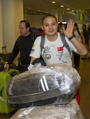 12月26日,中国成都农商银行车队车手周远德在机场向欢迎人群挥手致意。当日,周远德抵达阿根廷首都布宜诺斯艾利斯,准备参加明年1月1日发车的2011年达喀尔拉力赛。新华社发(马丁·萨巴拉摄)