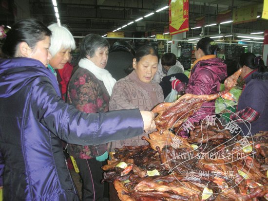 新年将近,市区各大超市纷纷摆出了各类腊味酱肉,显现出浓浓的年味。近日,记者走访了市区多家超市,发现一排排的腊味酱肉飘着诱人的香味,品种丰富多样,有腊猪头、酱鸭、火腿等,前来选购新鲜腊味酱肉的市民络绎不绝。