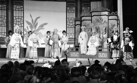 27日至28日,嵊州市长乐镇上南庄村举行了第七届文化体育节。今年该村除了传统的乐队演出和篮球比赛外,专门邀请该市越剧团进村演大戏,让全镇的农民一起过节。图为昨日该市越剧团演出越剧《孟丽君》的现场。 (记者 张亮宗 摄)