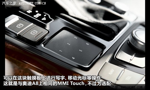 通过这块触触摸板,可以像操作鼠标一样移动光标,比按键操作便捷多了。不仅如此,它还能识别多国语言,在输入导航目的地时尤为方便,而且还可以定制诸如收音机电台之类的六个快捷键,分别对应触摸板上的六个数字。当然,这项装备并不是标准配置,来到国内后肯定也只是在高端车型上才有。