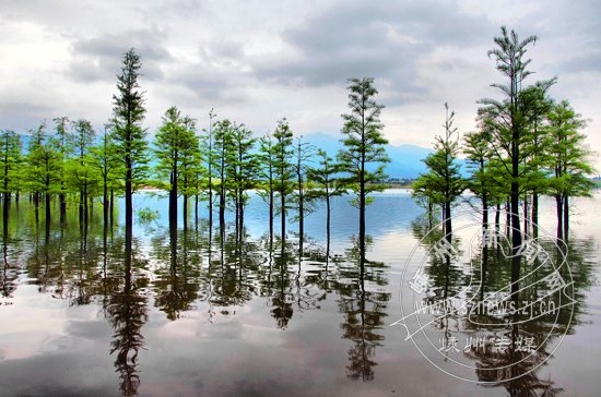 点评:水杉层染,湖水悠蓝,渲染着一种秋的气息。如镜的水面给人以宁静的感觉,远山、远亭相互呼应,表达了水光潋滟的生态效果。
