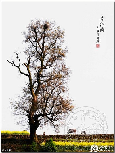 点评:简洁的线条,大面积天空的留白。牛、老树、油菜花等简洁的元素,再加上右上方天空留白处的“落款”,写意般地传递了春天的信息,点、线、面表现较好。