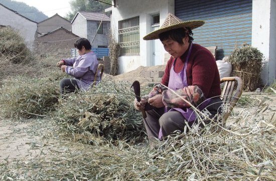 近日,记者在谷来镇三合村了解到,利用砍伐毛竹时留下的枝丫可制作扫把,一串毛竹枝丫可以卖到0.45元,这让赋闲在家的农村妇女多了一笔较为可观的收入。图为三合村石仓自然村的妇女正在整理毛竹枝丫。