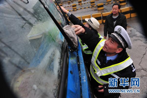 1月2日,在贵州省贵(阳)黄(果树)高速公路金关收费站入口处,当地交警帮助滞留车辆的驾驶员除冰。当日,贵阳的最低温度为-4℃,由于大范围的凝冻,贵州贵(阳)黄(果树)、贵(阳)遵(义)、贵阳绕城高速等多条高速公路封闭。 新华社记者杨楹 摄