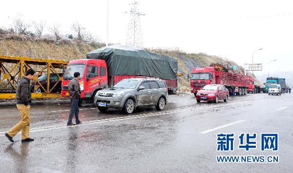 记者明星、陈文广长沙报道,1日夜间至2日凌晨,因贵州境内高速公路结冰严重,临时交通管制,封闭了与湖南交界的贵州一侧收费站,导致贯穿中国东西部的公路交通主动脉沪昆(上海至昆明)高速湖南怀新(怀化至新晃)路段严重堵车,湖南境内往贵州方向车辆滞留约6公里,目前虽经两省路政部门积极疏导,但由于大雪和冻雨持续,交通状况依然严峻。