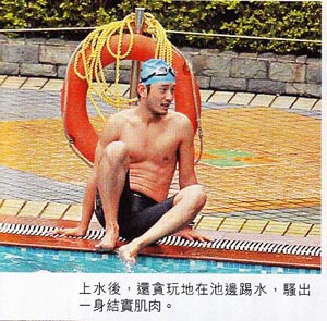 近日网上流传多张疑似Angelababy在酒店陪黄晓明游泳照,赤裸上身的他,露出健硕的胸肌和六块腹肌;在Angelababy和黄母从旁打气下,男方加把劲游了几转后,未有失威的他,上水后更现激凸情况。